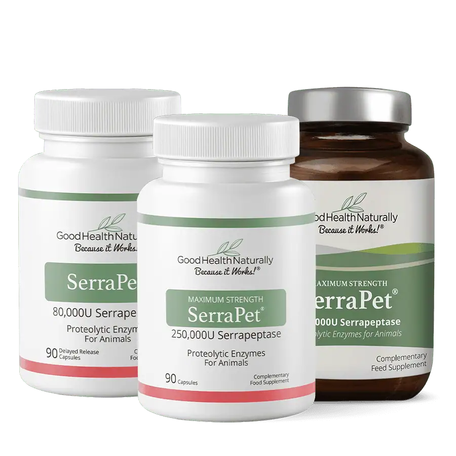 Ideal for dogs and other animals. The guideline for dosages with animals would be equivalent to the human doses (see the SerraEnzyme details) but should be reduced according to size; for instance a horse maybe the equivalent in size to a human, whereas you would reduce the dose slightly for an Alsatian, but even less for a smaller dog.
